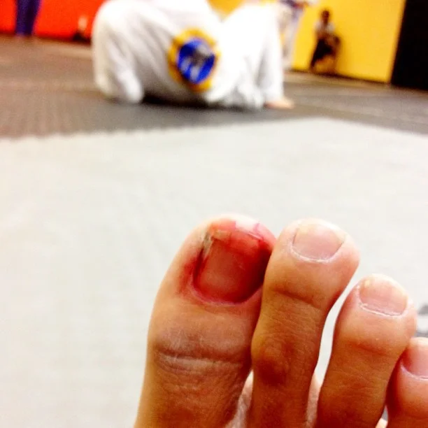 September 26, 2012 Bryan Kim Busted toe, can’t bend neck, bruised everywhere. Why do I do this again? #nopainnogain (Taken with Instagram)